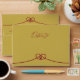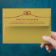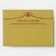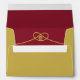 A modern and minimalist burgundy red and yellow gold circle double happiness knot of union, love and marriage on a wedding envelope with personalised return name and address.