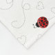 This fleece blanket features a cute pattern of red and black ladybugs leaving a heart trail on a white background. At the top is a contrasting border of black polka dots on bright red. Her name is in black on a white circle that separates the two design parts. Cute, and personalised just for her!