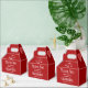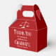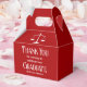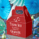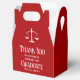 This modern custom law school graduation party favour box features the college graduate name in elegant white script on red for the class of 2026. Customise with your university under the scales of justice with a graduation thank you message for a new lawyer.