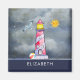 A magnet with a whimsical red-striped lighthouse and a colourful beach ball resting against its wall. A grey seagull flies off in the distance. A yellow sun smiles happily in the sky. Billowing stormy clouds closing in from behind. All done in watercolors.
