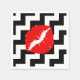 Bright red puckered lips against black and white chevron or zigzag pattern.