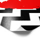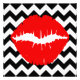 Bright red puckered lips against black and white chevron or zigzag pattern.