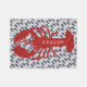 Red lobster little boy's blanket with name template.  Tiny blue lobsters over light grey is the background on this fun design for a child who loves the sea.