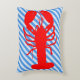 Throw pillow with a red lobster against blue and white nautical strips.