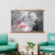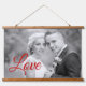 Red Love script typography wedding photo hanging wood topped tapestry. Just change image!