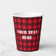 Red lumberjack buffalo plaid custom paper cups. Disposable party supplies with chequered pattern. Double sided print personalised with your text. Fun for Birthday, BBQ, wedding, engagement, anniversary, office party and more. Great for coffee and other drinks. Red and black or custom colour.