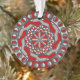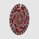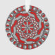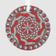 This concentric circle design contains layers of geometric patterns that resemble gears that you might find in modern or even alien machinery, in shades of red and grey.