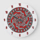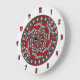 This concentric circle design contains layers of geometric patterns that resemble gears that you might find in modern or even alien machinery, in shades of red and grey.