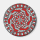 This concentric circle design contains layers of geometric patterns that resemble gears that you might find in modern or even alien machinery, in shades of red and grey.