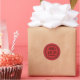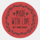 A personalised "made with love" sticker on a red background surrounded by a laurel wreath. Make it yours by adding your own name. A pretty finishing touch for all of your handmade gifts. Designed for you by Blackberry Boulevard.