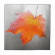 Red maple tree leaf against grey background. Textured photography. Autumn theme. Grey autumn day. Minimal colours.