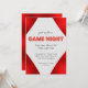 This custom invitation features an elegant game night party theme. The background features a soft silver glitter diamond over a metallic style red background. The "Game Night" title is printed in a red and gold glitter marquee sign design.