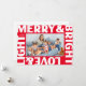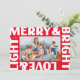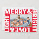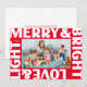 Solid festive red light up this modern text frame holiday card with the wording "Merry & Bright Love & Light." This bold seasonal greeting card features simple and easy to edit family name text and space for your best landscape photo of the season. The back side has template text but you can add more photos too.