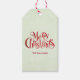 Gift tags with a fancy typographical design with a festive font in red which says Merry Christmas.