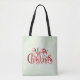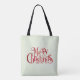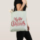 Tote bag with a fancy typographical design with a festive font in red which says Merry Christmas.
