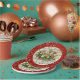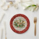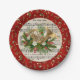 The centerpiece of these paper plates is a french horn decorated for Christmas with pine sprigs, holly leaves, red berries, and flowers, against a vintage sheet music carol. Around the edge is a red metallic background with a pattern of gold music notes.