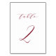 Table 2. Elegant table numbers card featuring red minimalist script. This red and white table number is perfect for weddings, graduation, baby showers, bridal showers and other events. Other number and colour are available.