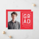 Simple, modern graduation announcements displaying the graduate's photo and "Grad" framed by a white rectangle with a red background (or colour of your choice. Personalise the front of the photo graduation announcement by adding the graduate's name, school name, and graduation year. The graduation announcement reverses to display a solid red background with space for additional photos and text.