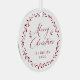 Personalised Christmas ornaments feature elegant trendy merry Christmas script and botanical leaves in red colour, with family photo on the back, modern and simple.