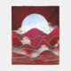 Abstract landscape design in various shades of red with a moonrise, hills, trees, clouds, and birds.
