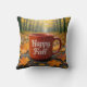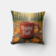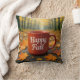 A red mug with 'Happy Fall' written on it sits on a wooden table surrounded by autumn leaves