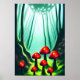 Some small red mushroom standing in a small opening in the forest with tree in the background. This is a AI generated art.