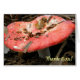 A red wild mushroom pushes through the debris and detritus on the forest floor