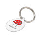 A pet tag with a red mushroom and name on the front, and contact details on the back.