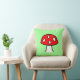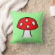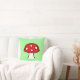 The front of the pillow has a large cartoon fly agaric mushroom with a mint green background. The back has an overlapping pattern of the mushrooms.