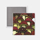 A magnet with lots of red capped mushrooms with white dots and pale stems.