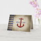 Red nautical anchor with blue stripe border on vintage brown textured background.
