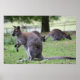 A red-necked wallaby stands on it's back legs with 2 other wallabies in the background.
