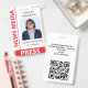 Simple vertical press ID in black with an eye-catching red color accent. News Media is written along the side, with Press beneath. Personalize this press ID template with the name of the reporter or photographer, their work title, ID photo, and the name of the publication that's sent this reporter out into the field. Add expiration date at the top. On the back of this practical journalist ID badge, personalize the QR code and add additional text.