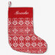 Festive red and white Nordic sweater patterned stocking features your name or monogram at the top in white calligraphy script lettering.