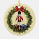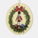 Beautiful red nutcracker doll in wreath round ornament. This lovely double sided holiday art ceramic ornament features a red nutcracker in the centre of a holiday wreath with pine cones and berries! A wonderful addition to your ornament collection or holiday decor and a great gift for family, friends and someone who loves the nutcracker!