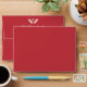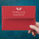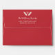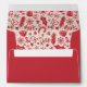 Red Christmas envelope with a patterned lining featuring holiday-themed doodles. On the flap of the red envelope, you can add your name and return address beneath a heart and two pine needle twigs.