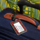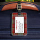 Stylish luggage tag done in traditional red and grey Ogilvie tartan plaid pattern. A white text area, on the front, has black and blue text ready to personalise with your information. The perfect way to spot your luggage, and makes a great gift idea.