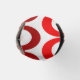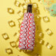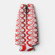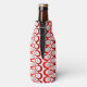 This bottle cooler has a mid-century modern design of string of ovals in red and brick red, with white ovals and circles made of lines inside them.