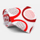 This necktie has a mid-century modern design of string of ovals in red and brick red, with white ovals and circles made of lines inside them.