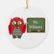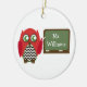 An ornament for teachers featuring an illustration of a red owl standing at chalkboard. Owl has a black chevron belly. Personalise with your name on chalkboard.