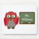 A mousepad for teachers featuring an illustration of a red owl standing at a chalkboard. Owl has a black chevron belly. Personalise with your name on chalkboard. Look for matching items at The Pink Schoolhouse.