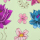 A cute red panda holding its fluffy tail. Fuchsia and blue lotus flowers, cherry blossoms and henna all in a backdrop of green are all around the red panda. Drawn in a tattoo style.