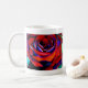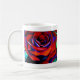 Valentine mug with original design of red English rose macro flower from original watercolour artwork painting by Sacha Grossel Art. Large close up of crimson flower with blue highlights inspired by love and passion.