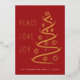 An elegant modern holiday card features an abstract line art tree with PEACE LOVE JOY in gold foil on a red card.