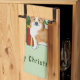 Destei's original cartoon illustration of a red and white coat colour Pembroke Welsh Corgi breed dog. The dog is standing by a festive Christmas tree decorated with red and yellow ornaments, a white pearl garland and a yellow star that is placed on the top of the tree. There are also two wrapped presents by the tree and behind the dog there is a brown shelf with two candles. The background colour is light green and there is also a personalizable text area that now reads: "Merry Christmas!".