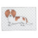 Destei's original cartoon illustration of a cute long hair red piebald coat colour Dachshund breed dog. The background has a pattern of grey dog paw prints.