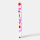 A fun phone case with script letters on a background pattern of red and pink polka dots and circles.