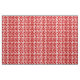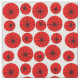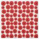 This fabric has a mid-century modern design of red pinwheels made with red circles and black "spokes" on a white background.