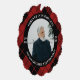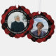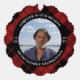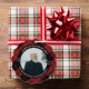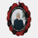 Memorial photo ornament with your loved one's photo, name, and years living in a curved text on black around your loved one's photo surrounded by a red and black plaid pattern.