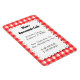A custom restaurant advertising magnet with script letters for the title and readable serif letters for your address and information, on a faux doily and a red plaid background. Customise it to change fonts, sizing, background colours and more, even save your design for later.